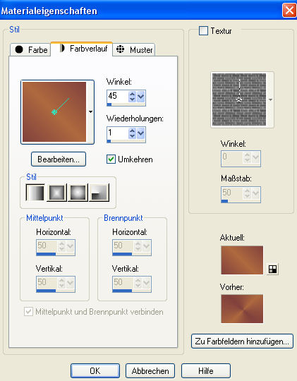 Dieses Tutorial habe ich selbst entworfen und es unterliegt meinem Copyright. Das Material stammt aus Tauschgruppen und das Copyright liegt beim jeweiligen Künstler. Ich habe das Tutorial mit Paint Shop Pro X2 geschrieben, es läßt sich aber mit allen anderen PSP-Versionen problemlos nachbasteln. Du benötigst: Paint Shop Pro Tuben: 1 Maske 1 Paartube 1 Blumentube 1 Tiertube Mein Material kannst Du Dir hier herunterladen. Filter: Graphics Plus - Cross Shadow Hast Du alles zusammen? Dann lass uns beginnen! 1. Öffne Dir ein neues transparentes Arbeitsblatt in 550 x 400 Pixel Größe. 2. Such Dir aus Deinen Tuben eine helle Vordergrundfarbe (meine ist #ae693f) und eine dunklere Hintergrundfarbe (meine ist#81413d). Erstelle aus diesen Farben einen Farbverlauf. Ich habe diesen gewählt: