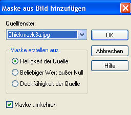und fülle Dein Blatt damit. 3. Lege eine neue Rasterebene an und fülle die Ebene mit Deiner Vordergrundfarbe. Dazu mußt Du den Mischmodus Deines Farbeimers auf "Deckende Bereiche" stellen. 4. Öffne die Maske "Chickmask3a.jpg" oder Deine eigene Maske in PSP und minimiere sie. Ebenen - neue Maskenebene - aus Bild und lade Deine Maske mit diesen Einstellungen: