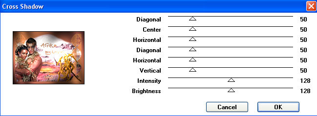 Ebenen - Einbinden - Gruppe zusammenfassen. Effekte - Kanteneffekte - Nachzeichnen. 5. Kopiere das Tube "AH_Sonnenuntergang_in_Afrika_1906_08.pspimage" oder Deine eigene Tiertube und füge sie als neue Ebene auf Deinem Bild ein. Ebenen - Anordnen - Nach unten verschieben. 6. Kopiere das Tube "jet-couple01s-juni-2008.pspimage" oder Deine eigene Paartube und füge sie auf Deinem Bild als neue Ebene ein. Passe sie größenmäßig an. Wenn Du die beigelegte Tube verwendest, dann gehe auf Bild - Größe ändern - 70% (Größe aller Ebenen anpassen nicht angehakt). Anpassen - Schärfe - Scharfzeichnen. Verschiebe das Tube nach links an den Rand. 7. Kopiere das Tube " Mtm_bomen 17_ blad -small-13 juni 2007.pspimage" oder Dein eigenes Blumentube und füge es als neue Ebene auf Deinem Bild ein. Passe es größenmäßig an. Ich habe meine Blumentube auf 50% verkleinert (Größe aller Ebenen anpassen nicht angehakt). Anpassen - Schärfe - Scharfzeichnen. Verschiebe die Tube nach rechts unten an den Rand. 8. Setze Deinen Schriftzug, Dein Wasserzeichen oder Deinen Namenszug auf´s Bild. 9. Fasse alle Ebenen sichtbar zusammen. Bild - Rand hinzufügen - 15 Pixel symmetrisch in einer Farbe die nicht in Deinem Bild vorkommt. Markiere den Rand mit Deinem Zauberstab. Fülle die Auswahl mit Deinem Farbverlauf. 10. Wende den Filter Graphics Plus - Cross Shadow mit diesen Einstellungen an: