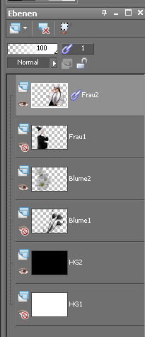 Ich habe die Tube auf 70% verkleinert (Größe aller Ebenen anpassen nicht angehakt). Benenne die Ebene um in Blume1. 4. Mache nun die Ebene HG1 und Blume1 unsichtbar und die Ebene HG2 sichtbar. Aktiv ist aber Deine Ebene Blume1. Kopiere das Tube "git-tubes_Angel_Flower_by_Hitomii.pspimage" oder Dein zweites Blumentube und füge es auf Deinem Bild als neue Ebene ein. Benenne die Ebene um in Blume2. 5. Mache nund die Ebenen HG1, Blume1 sichtbar... die Ebenen HG2 und Blume2 sind unsichtbar. Aktiv ist Deine Ebene Blume1. Kopiere das Tube "Yoka-Photos-Ladies-WhiteHair080608-small.pspimage" oder Deine eigene Frauentube und füge sie als neue Ebene auf Deinem Bild ein. Passe sie größenmäßig an. Ich habe das Tube auf 80% verkleinert (Größe aller Ebenen anpassen nicht angehakt). Benenne sie um in Frau1. 6. Deine Ebenen HG1, Blume1 und Frau1 sind nun unsichtbar und die Ebenen HG2 und Blume2 sichtbar. Aktiv ist die Ebene Blume2. Kopiere das Tube "SS_1867.pspimage" oder Dein eigenes zweites Frauentube und füge es als neue Ebene auf Deinem Bild ein. Passe es größenmäßig an. Ich habe das Tube auf 70% verkleinert (Größe aller Ebenen anpassen nicht angehakt). Benenne die Ebene um in Frau2. 7. Wenn Du alles richtig gemacht hast, dann sieht Dein Ebenenmanager nun so aus: