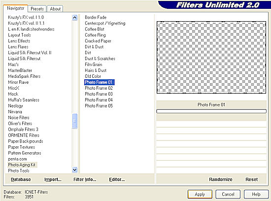8. Lasse alle Sichtbarkeits- und Unsichtbarkeitseinstellungen so. Aktiv ist Deine oberste Ebene. Lege eine neue Rasterebene an. Auswahl - Alles auswählen Fülle die Ebene mit Deiner Vordergrundfarbe. Auswahl - Ändern - Verkleinern - um 8 Pixel. Drücke einmal die Entf-Taste auf Deiner Tastatur. Auswahl - Umkehren Wende den Filter Photo Aging Kit - Photo Frame 01 mit diesen Einstellungen an: