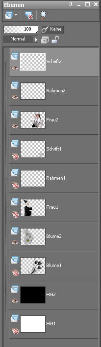 Hebe die Auswahl auf. Benenne die Ebene um in Rahmen2.... nein... das ist kein Schreibfehler... wirklich umbenennen in Rahmen2. 9. Mache die Ebenen HG2, Blume2 und Frau2 unsichtbar. Die Ebenen HG1, Blume1 und Frau1 machst Du sichtbar. Aktiv ist Deine Ebene Frau1. Ebenen - Neue Rasterebene Auswahl - Alles auswählen Fülle die Auswahl mit Deiner Hintergrundfarbe. Auswahl - Ändern - Verkleinern - um 8 Pixel Drücke die Entf-Taste auf Deiner Tastatur. Auswahl - Umkehren Wende noch einmal den Filter Photo Aging Kit - Photo Frame 01 an. Hebe die Auswahl auf. Benenne die Ebene um in Rahmen1. 10. Setzt nun in der Hintergrundfarbe den Schriftzug "Black" auf Euer Bild und schreibt auch in der Hintergrundfarbe Euren Namenszug. Ebenen - Einbinden - Nach unten zusammenfassen. Benennt die Ebene um in Schrift1. 11. Macht jetzt die Ebenen HG1, Blume1, Frau1, Rahmen1 und Schrift1 unsichtbar. Die Ebenen HG2, Blume2, Frau2 und Rahmen2 macht sichtbar. Aktiv ist die Ebene Rahmen2. Schreibt nun in Eurer Vordergrundfarbe den Schriftzug "White" auf Euer Bild und ebenfalls in der Vordergrundfarbe Euren Namenszug. Ebenen - Nach unten zusammenfassen. Benennt die Ebene um in Schrift2. 12. So sieht es jetzt bei Euch im Ebenenmanager aus: