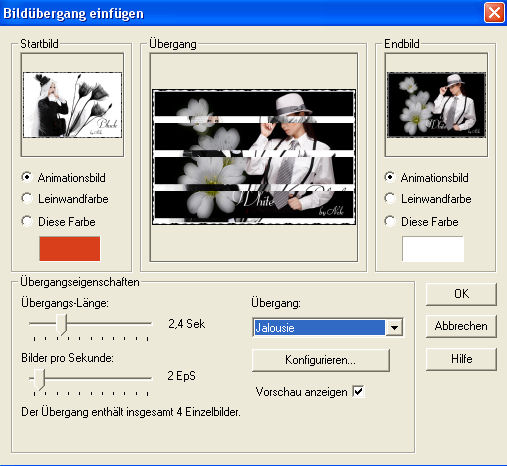 13. Aktiviere nun Deine Ebene HG1. Mache die Ebenen HG1, Blume1, Frau1, Rahmen1 und Schrift1 sichtbar und die Ebenen HG2, Blume2, Frau2, Rahmen2 und Schrift2 unsichtbar. Fasse alle Ebenen sichtbar zusammen. Bearbeiten - Kopieren 14. Im Anishop als neue Animation einfügen. 15. Zurück in PSP machst Du die zusammengefasste Ebene unsichtbar, aktivierst Deine Ebene HG2 und machst die Ebenen HG2, Blume2, Frau2, Rahmen2 und Schrift2 sichtbar. Fasse alle Ebenen sichtbar zusammen. Bearbeiten - Kopieren 16. Im Anishop einfügen - Nach dem aktuell ausgewählten Einzelbild. Klicke nun in den grauen Rand Deines ersten Einzelbildes und gehe auf Effekte - Bildübergang einfügen - Jalousie mit diesen Einstellungen: