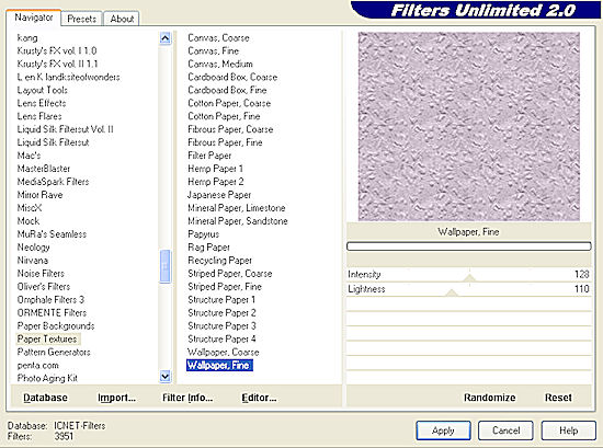Hebe die Auswahl auf. 5. Dupliziere den Streifen und spiegele ihn einmal horizontal (Bild - Horizontal spiegeln) und setze ihn an die untere Kante Deines Hintergrundbildes. 6. Kopiere das Tube "aclis_pearls_002_2008.pspimage" oder Deine eigene Schmucktube und füge sie auf Deinem Bild als neue Ebene ein. Verschiebe sie so wie Du auf meinem Vorschaubild sehen kannst. Dupliziere die Tube einmal und gehe auf Ebenen - Einbinden - Nach unten zusammenfassen. Ich habe das Tube noch auf 80% verkleinert (Bild - Größe ändern - auf 80% - Größer aller Ebenen anpassen nicht angehakt). 7. Kopiere das Tube "cy_dewyrose_2005.pspimage" oder Deine eigene Blumentube und ändere die Größe auf 60% (Größe aller Ebenen anpassen nicht angehakt). Verschiebe die Tube nach links oben in die Ecke und setze den Mischmodus auf "Helligkeit (Vorversion)" im Ebenenmanager. 8. Kopiere das Tube "Giada_blonde_squaw.pspimage" oder Deine eigene Frauentube und füge sie als neue Ebene auf Deinem Bild ein. Verschiebe sie an den rechten Rand. Ich habe meine Frauentube noch zweimal dupliziert und die Ebenen zweimal nach unten zusammengefasst. 9. Aktiviere Deine unterste Ebene (klicke einmal im Ebenenmanager drauf) und wende den Filter Unlimited - Paper Textures - Wallpaper fine mit diesen Einstellungen an: