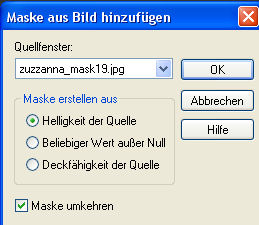 Dieses Tutorial habe ich selbst entworfen und das Copyright liegt bei mir. Das Material stammt aus Tauschgruppen und das Copyright liegt beim jeweiligen Künstler. Ich habe das Tutorial mit Paint Shop Pro X2 geschrieben, es läßt sich aber mit allen anderen PSP-Versionen problemlos nachbasteln. Du benötigst: Paint Shop Pro Tuben: 3 Masken 1 Discotube 2 Frauentuben Mein Material kannst Du Dir hier herunterladen. Filter: Muras Seamless - Emboss at Alpha Filter Factory Gallery A - Spotlight Hast Du alles zusammen? Dann lass uns beginnen! 1. Öffne Dir ein neues transparentes Arbeitsblatt in 700 x 550 Pixeln Größe. 2. Suche Dir aus Deinen Tuben eine helle Vordergrundfarbe (meine ist #753d7d) und eine dunkle Hintergrundfarbe (meine ist #4a1f53). Fülle Dein Blatt mit Deiner Vordergrundfarbe. 3. Kopiere das Tube "mds8266 Abstract.pspimage" oder Euer eigenes Discotube und fügt es als neue Ebene auf Eurem Bild ein. Ich habe meine Tube nun nach unten an den Rand verschoben und den oberen Teil wegradiert. Setze den Mischmodus im Ebenenmanager auf "Helligkeit (Vorversion)" (in älteren PSP-Versionen "Helligkeit (L)"). 4. Lege eine neue Rasterebene an und fülle sie mit Deiner Hintergrundfarbe. Stelle dazu den Auswahlmodus Deines Farbeimers auf "Deckende Bereiche". Öffne die Maske "zuzzanna_mask19.jpg" oder Deine eigene Maske in PSP und minimiere sie. Ebenen - Neue Maskenebene - Aus Bild und lade die Maske mit folgenden Einstellungen: