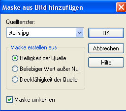 6. Suche Dir aus Deinen Tuben eine sehr helle Farbe (meine ist #fbe2ff) und lege eine neue Rasterebene an. Fülle sie mit der hellen Farbe. Der Auswahlmodus des Farbeimers sollte wieder auf "Deckende Bereiche" stehen. Öffne Dir die Maske "stairs.jpg" oder Deine eigene Treppenmaske in PSP und minimiere sie. Ebenen - Neue Maskenebene - Aus Bild und lade Deine Maske mit folgenden Einstellungen: