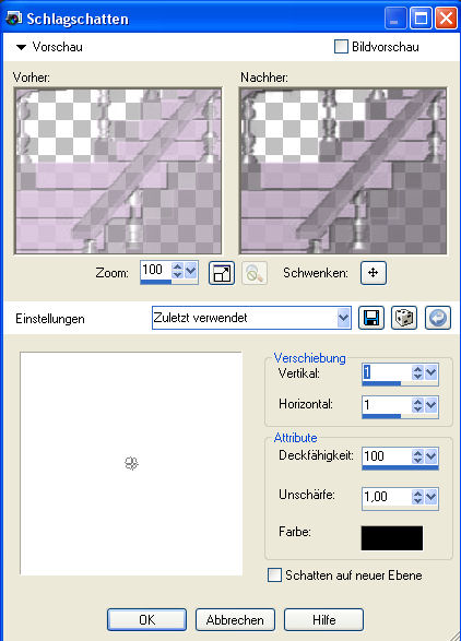 8. Kopiere das Tube "Terry_Lilly_Jan07.pspimage" oder Dein eigenes Frauentube und füge es als neue Ebene auf Deinem Bild ein. Wenn Du die beigelegte Tube verwendest, dann verkleinere sie auf 60%. Verschiebe sie auf die Treppe. Gib der Dame noch diesen Schlagschatten:
