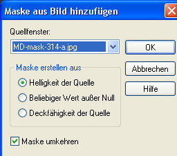 9. Lege eine neue Rasterebene an und fülle sie mit Deiner Vordergrundfarbe. Der Auswahlmodus Deines Farbeimers muß wieder auf "Deckende Bereiche" stehen. 10. Öffne die Maske "MD-mask-314-a.jpg" oder Deine eigene dritte Maske im PSP und minimiere sie. Ebenen - Neue Maskenebene - Aus Bild - suche Dir dort Deine Maske und lade sie mit folgenden Einstellungen:
