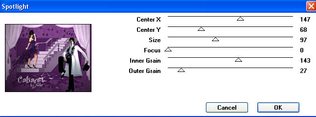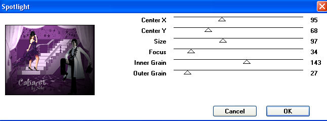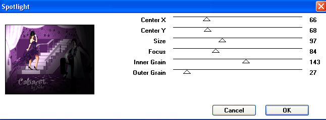 Ebenen - Einbinden - Gruppe zusammenfassen. Verschiebe die Maskenebene soweit nach oben, dass der mittlere Bogen des Vorhangs nicht mehr zu sehen ist. 11. Kopiere das Tube " AH_Woman_1806_08.pspimage" oder Deine eigene zweite Frauentube und füge sie als neue Ebene auf Deinem Bild ein. Passe sie größenmäßig an. Ich habe die Tube auf 60% verkleinert (Größe aller Ebenen anpassen nicht angehakt) und sie vertikal gespiegelt. Anpassen - Schärfe - Scharfzeichnen. Verschiebe sie auf die rechte Seite Deines Bildes. 12. Setze nun Deinen Schriftzug auf´s Bild und vergiß Dein Wasserzeichen oder Deinen Namenszug nicht. 13. Fasse alle Ebenen zusammen und wende den Filter Factory Gallery A - Spotlight mit diesen Einstellungen an: