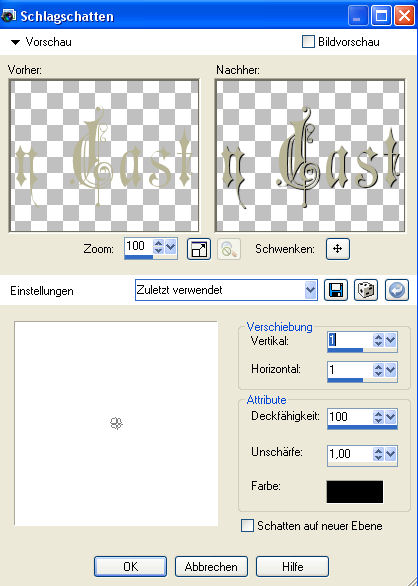 Ebenen - Einbinden - Gruppe zusammenfassen. 7. Kopiere das Tube "stillife47-mistedbydragonblue0408.pspimage" oder Dein eigenes Blumentube und füge es als neue Ebene auf Deinem Bild ein. Schiebe es nach unten rechts in die Ecke. 8.Kopiert jetzt das Tube "by_stirner_maravilhosa.pspimage" oder Eure eigene Frauen- oder Fantasytube und fügt sie als neue Ebene auf Eurem Bild ein. Schiebt sie nach links unten an den Rand. Wenn Ihr die beigelegte Tube verwendet, dann dupliziert sie einmal. Wenn Ihr eine eigene verwendet, dann müßt Ihr sie evtl. Größenmäßig anpassen. 9. Fasst alle Ebenen sichtbar zusammen (Ebenen - Einbinden - Sichtbare zusammenfassen). 10. Beschriftet Euer Bild nun nach Belieben und vergesst auch Euer Wasserzeichen oder Euren Namenszug nicht. Ich habe auf die Beschriftung noch diesen Schlagschatten angewendet:
