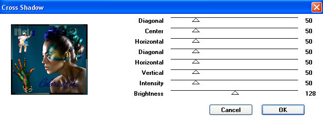und hebe die Auswahl nun auf. 8. Setze in Deiner Vordergrundfarbe Deinen Namenszug oder einen anderen Schriftzug auf´s Bild, lasse jedoch den letzten Buchstaben weg. 9. Schreibe nun in einer ganz anderen Farbe mit der selben Schrift den letzten Buchstaben. 10. Markiere nun mit Deinem Freihandlassowerkzeug einen Teil Deines letzten Buchstabens und fülle ihn mit der Farbe mit der Du Deinen Text geschrieben hast (bei mir ist das die Vordergrundfarbe). Hebe die Auswahl auf. 11. Öffne und kopiere das Tube "MD-Ays-3.psp" oder Dein eigenes Tube und füge es als neue Ebene auf Deinem Bild ein. Verschiebe es so, dass es auf den Farbübergang des letzten Buchstaben passt. 12. Wenn Du magst setzt Du nun noch einen Schriftzug auf Dein Bild oder einen schönen Pinsel. 13. Fasse alle Ebenen zusammen. 14. Wende den Filter Graphics Plus - Cross Shadow mit diesen Einstellungen auf das gesamte Bild an: