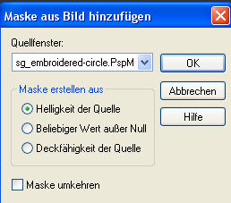 Ebenen - Einbinden - Gruppe zusammenfassen. 5. Kopiere das Tube "mistedflowers.psp" oder Dein eigenes Blumentube und füge es als neue Ebene auf Deinem Bild ein. Schiebe das Tube nach unten rechts an den Rand Deines Bildes. 6. Lege eine neue Rasterebene an und fülle diese mit einer dunklen Farbe aus Deinen Tuben (bei mir ist das #b82a36). 7. Öffne die Maske "sg_embroidered-circel.PspMask" oder Deine eigene Maske im PSP und minimiere sie. Ebenen - Neue Maskenebene - Aus Bild und lade Dir Deine Maske mit diesen Einstellungen: