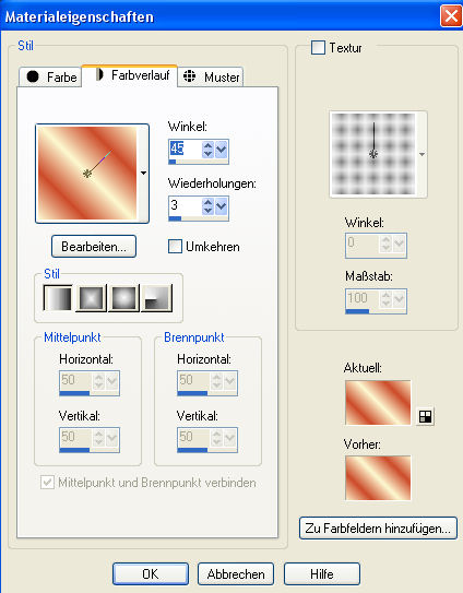 in den inneren Kreis Deiner Maske. Kopiere das Tube "christmist_LightuptheN_.pspimage" oder Dein eigenes Citytube und füge es in eine Auswahl ein. Hebe die Auswahl auf. 10. Kopiere das Tube "ED-mars-35.pspimage" oder Deine eigene Frauentube und füge sie als neue Ebene auf Deinem Bild ein. Wenn Du die beigelegte Frauentube verwendest kannst Du sie so belassen, wenn Du eine eigene verwendest mußt Du sie evtl. größenmäßig anpassen. Schiebt Euch die Tube dahin, wie auf meinem Vorschaubild zu sehen oder an einen Platz, der Euch gefällt und stellt den Mischmodus im Ebenenmanager auf "Helligkeit (Legacy)" - Hinweis: Bei aälteren PSP-Versionen heißt der Mischmodus "Helligkeit (Vorversion). Dieser Mischmodus muß aber nicht für alle Tuben passend sein ..... spielt und probiert ruhig etwas herum. Radiert Euch störende Teile auf der Frauentube ruhig weg. Dazu müßt Ihr dann natürlich immer die Ebene aktivieren von der Euch auf der Frauentube etwas stört. Bei mir war es die zweite Maskenebene. 11. Stellt Eure Vordergrundfarbe wieder auf die ursprüngliche Vordergrundfarbe die Ihr Euch notiert hattet und erstellt aus Vorder- und Hintergrundfarbe einen schönen Farbverlauf. Ich habe diesen gewählt: