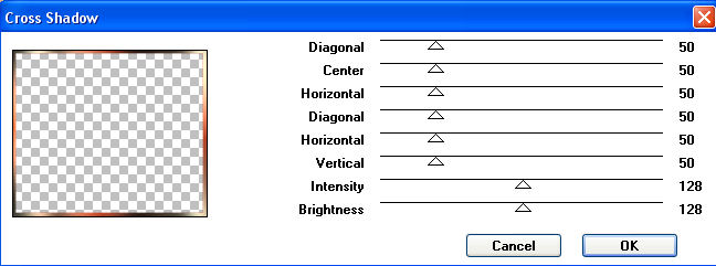 Legt eine neue Rasterebene an, füllt mit Eurem Farbverlauf und geht auf Auswahl - Alles auswählen - Ändern - Verkleinern - um 8 Pixel und drückt einmal die Entf-Taste. Auswahl - Umkehren und wendet den Filter Graphics Plus - Cross Shadow mit folgenden Einstellungen an: