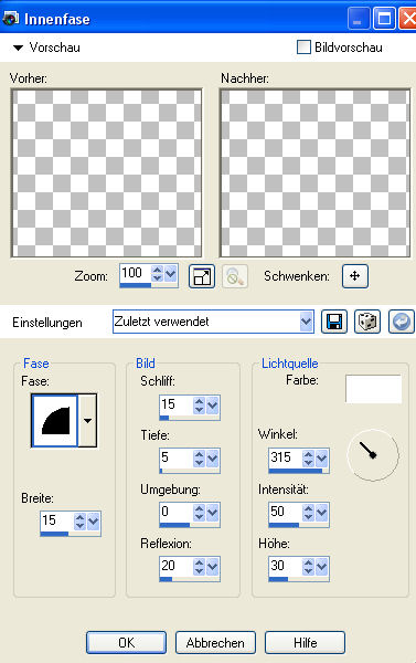 12. Lasst die Auswahl noch bestehen und geht auf Effekte - 3D-Effekte - Innenfase mit diesen Einstellungen: