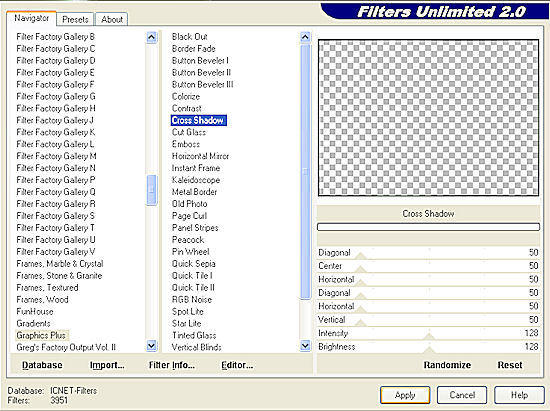 5. Kopiere nun das Tube "AH_Dark_Bild_2707_07.pspimage" oder Deine eigene Fantasy- oder Gothictube und füge sie als neue Ebene auf Deinem Bild ein. Passe Deine Tube größenmäßig an. Ich habe die von mir verwendetet Tube auf 90% verkleinert (Größe aller Ebenen anpassen nicht angehakt). 6. Kopiere das Tube "Marif_2007_08Aout_misted_decor0197.pspimage" oder Deine eigene Blätter- oder Blumentube und füge sie als neue Ebene auf Deinem Bild ein. Passe das Tube größenmäßig an. Ich habe die Tube auf 60% verkleinert (Größe aller Ebenen anpassen nicht angehakt) und sie einmal vertikal gespiegelt. Verschiebe die Tube nach links unten. 7. Lege eine neue Rasterebene an. Auswahl - Alles auswählen Fülle die Auswahl mit Deiner Vordergrundfarbe. Auswahl - Ändern - Verkleinern - um 5 Pixel Drücke einmal die Entf-Taste auf Deiner Tastatur. Auswahl - Umkehren Wende den Filter Graphics Plus - Cross Shadow mit den Standardeinstellungen an: