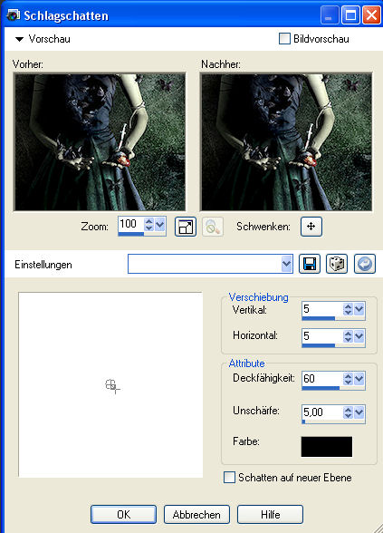 Hebe die Auswahl auf. 8. Fasse alle Ebenen sichtbar zusammen. Dupliziere die zusammengefasste Ebene und bleibe auf der duplizierten Ebene. Bild - Größe ändern - auf 90% (Größe aller Ebenen anpassen nicht angehakt). 9. Wende diesen Schlagschatten an: