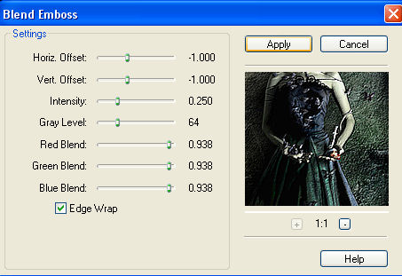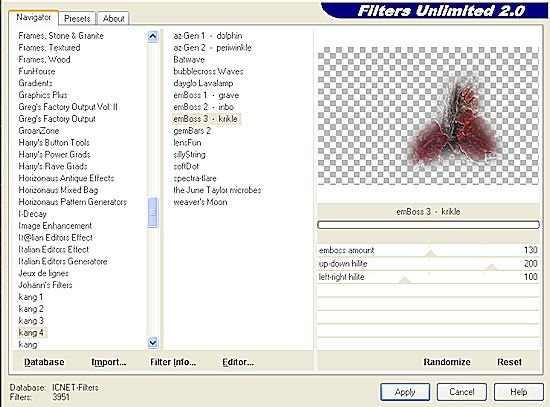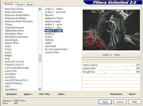 12. Aktiviere nun Deine unterste Ebene und wende den Filter Kang 4 - Emboss 3 - Krikle mit diesen Einstellungen an: