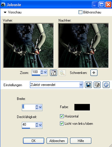 11. Aktiviere Deine mittlere Ebene und gehe auf Bild - Horizontal spiegeln. Jetzt auf Bild - Vertikal spiegeln. Effekte - Textureffekte - Jalousie mit diesen Einstellungen: