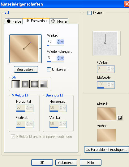 Dieses Tutorial habe ich selbst entworfen und es unterliegt meinem Copyright. Das Material stammt aus Tauschgruppen und das Copyright liegt beim jeweiligen Künstler. Ich habe das Tutorial mit Paint Shop Pro X2 geschrieben, es läßt sich aber problemlos auch mit allen anderen PSP-Versionen nachbasteln. Du benötigst: Paint Shop Pro Animationsshop Tuben: 1 Landschaftsbild (Tag) 1 Landschafts- oder Fantasybild (Nacht) oder entsprechende Tuben um Dir Deine Bilder selbst zu machen. Meine beiden Bilder sind aus Tuben selbst hergestellt. Material lege ich diesmal nicht dabei, denn Ihr bastelt oder sucht Euch am besten Bilder die Eurem Gegensatz entsprechen. Filter: Graphics Plus - Cross Shadow Filter Factory Gallery H - Raverberations Hast Du alles zusammen? Dann lass uns beginnen! 1. Öffne Dein Landschaftsbild welches Du für den Tag nehmen möchtest oder bastle Dir aus Tuben selbst ein schönes Bild zurecht. Wenn Du selbst ein Bild bastelst, dann mache das Tagbild erst komplett fertig, fasse dann alle Ebenen zusammen und speichere es als jpg zwischen. Minimiere es und bastele dann in der gleichen Größe Dein Nachtbild. Auch dieses dann als jpg zwischenspeichern und minimieren. Ich habe beide Bilder in 350 x 450 gebastelt. Wenn Du fertige Bilder verwendest, dann ändere Dir die Größe der beiden Bilder auch auf 350 x 450 Pixel. (Größe aller Ebenen anpassen ist angehakt und Seitenverhältnis beibehalten ist nicht angehakt) 2. Nimm Dir jetzt Dein Tagbild und arbeite damit erstmal weiter. Suche Dir zunächst eine helle Vordergrundfarbe aus Deinem Bild (meine ist #edd5b3) und eine dunklere Hintergrundfarbe (meine ist #c19c75). Erstelle Dir aus diesen Farben einen schönen Farbverlauf. Ich habe diesen gewählt: