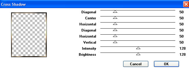 3. Füge Deinem Bild nun einen 5 Pixel breiten symmetrischen Rand hinzu in einer Farbe, die nicht in Deinem Bild vorkommt. Markiere diesen Rand mit dem Zauberstab und und fülle die Auswahl mit Deinem Farbverlauf. Lasse die Auswahl noch bestehen. 4. Wende auf den Rand den Filter Graphics Plus - Cross Shadow mit diesen Einstellungen an: