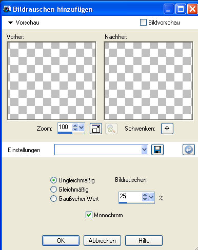 Hebe die Auswahl auf. 5. Füge Deinem Bild einen 15 Pixel breiten symmetrischen Rand in Deiner Vordergrundfarbe hinzu. Markiere den Rand mit dem Zauberstab. Gehe auf Anpassen - Bildrauschen hinzufügen/entfernen - Bildrauschen hinzufügen mit diesen Einstellungen: