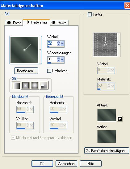 Hebe die Auswahl auf. 8. Füge Deinem Bild einen 5 Pixel breiten symmetrischen Rand hinzu in einer Farbe die nicht in Deinem Bild vorkommt. Markiere diesen Rand mit dem Zauberstab und fülle die Auswahl mit Deinem Farbverlauf. Wende den Filter Graphics Plus - Cross Shadow mit den Standarteinstellungen an (übernimm einfach alle Werte). Effekte - 3D-Effekte - Innenfase und übernimm hier auch wieder die eingestellten Werte (sie sind von vorhin noch gespeichert). Hebe die Auswahl auf. 9. Füge Deinem Bild einen 15 Pixel breiten symmetrischen Rand in Deiner Vordergrundfarbe hinzu und markiere den Rand mit dem Zauberstab. Anpassen - Bildrauschen hinzufügen/entfernen - Bildrauschen hinzufügen und übernimm auch hier die Einstellungen. Hebe die Auswahl auf. 10. Füge Deinem Bild einen 5 Pixel breiten symmetrischen Rand hinzu in einer Farbe die nicht in Deinem Bild vorkommt. Markiere diesen Rand mit dem Zauberstab und fülle die Auswahl mit Deinem Farbverlauf. Wende den Filter Graphics Plus - Cross Shadow mit den Standarteinstellungen an (übernimm die Werte). Effekte - 3D-Effekte - Innenfase und übernimm auch hier wieder die Werte. Hebe die Auswahl auf. 11. Füge evtl. einen Schriftzug hinzu und vergiß auch Dein Wasserzeichen oder Deinen Namenszug nicht. Fasse alle Ebenen zusammen. Minimiere jetzt Dein Bild in PSP, aber nicht schließen.... wir brauchen es noch. 12. Öffne nun Dein Bild welches Du für die Nacht ausgesucht oder gebastelt hast. Suche Dir aus Deinem Bild eine helle Vordergrundfarbe (meine ist #586559) und eine dunkle Hintergrundfarbe (meine ist #2e3935). Erstelle Dir aus diesen Farben jetzt den gleichen Farbverlauf, den Du schon beim Tagbild verwendet hast..... nur eben jetzt mit den anderen Farben. Nochmal zur Erinnerung.... ich hatte diesen gewählt: