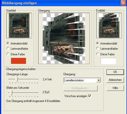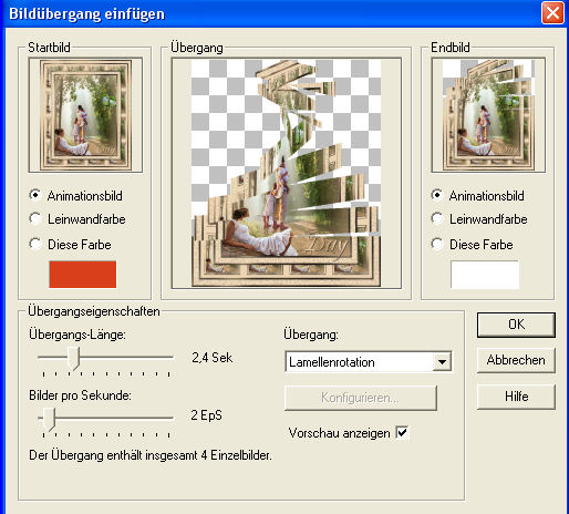 25. Klicke nun in den grauen Rand Deines 6. Einzelbildes und gehe wieder auf Effekte - Bildübergang einfügen mit diesen Einstellungen: