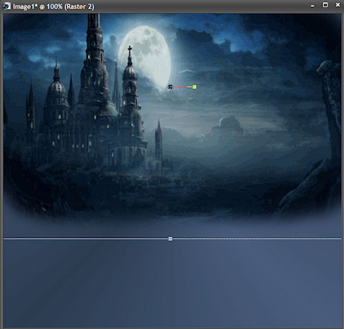 Fülle Dein Blatt damit. 3. Lege eine neue Rasterebene an. Auswahl - Alles auswählen Kopiere das Tube "AH_Burg_2506_08.pspimage" oder Dein erstes Landschaftstube und füge es in eine Auswahl auf Deinem Blatt ein. Hebe die Auswahl auf. Verschiebe das Tube nach oben an den Rand und ziehe es Dir mit dem Objektauswahlwerkzeug (in älteren Versionen Rasterverformungswerkzeug) passend zurecht: