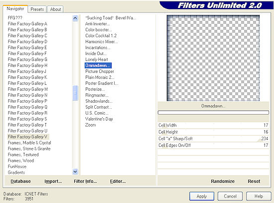 4. Kopiere nun das Tube "GatewayToDreamland-misted by dragonblu0408.pspimage" oder Dein zweites Landschaftstube und füge es als neue Ebene auf Deinem Bild ein. Verschiebe es nach rechts in Randnähe und setze den Mischmodus im Ebenenmanager auf "Helligkeit "Vorversion" (in äteren PSP-Versionen "Helligkeit (Legacy)"). Da der Mischmodus immer abhängig von den Tuben ist kannst Du hier natürlich mit den verschiedenen Mischmodis auch gern ein wenig spielen. Probier es Dir einfach aus was zu Deinen Tuben am besten passt. Ziehe Dir das Tube evtl. auch mit dem Objektauswahlwerkzeug passend zurecht. 5. Kopiere nun das Tube "fantasy27-AOUT2008-creativeloves.png" oder Deine eigene Drachen- oder Fantasytube und füge sie als neue Ebene auf Deinem Bild ein. Passe sie größenmäßig an. Ich habe die Tube auf 70% verkleinert (Größe aller Ebenen anpassen nicht angehakt). 6. Schiebe Dir nun noch alle Deine Tuben passend auf Deinem Bild zurecht und gehe dann auf Ebenen - Einbinden - Sichtbare zusammenfassen 7. Lege eine neue Rasterebene an. Auswahl - Alles auswählen Fülle die Auswahl mit Deinem Farbverlauf (dazu mußt Du den Auswahlmodus Deines Farbeimers auf "Deckende Bereiche" stellen). Auswahl - Ändern - Verkleinern - um 8 Pixel Drücke einmal die Entf-Taste auf Deiner Tastatur. Auswahl - Umkehren 8. Wende nun den Filter Factory Gallery "V" - Ommadawn mit diesen Einstellungen an: