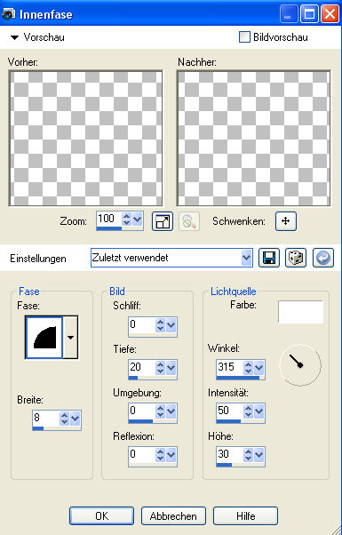 Diese Tutorial habe ich selbst entworfen und es unterliegt meinem Copyright. Das Material habe ich aus Tauschgruppen und das Copyright liegt beim jeweiligen Künstler. Ich habe das Tutorial mit Paint Shop Pro X2 geschrieben, es läßt sich aber auch mit allen anderen PSP-Versionen problemlos nacharbeiten. Du benötigst: Paint Shop Pro Tuben: 1 schönes Bild evtl. Corner *hüstel*... sorry... meine Allergie Hier gibt es kein Material zum Downlod, da jeder ganz sicher ein geeignetes Bild findet und Corner oder sonstige Deco hat auch jeder. Filter: Filters Factory Gallery H - Chaos Tile Alien Skin Eye Cany 4000 - Fire Dragonfly - Shear Hast Du alles zusammen? Dann laß uns beginnen! 1. Öffne Dir Dein Bild welches Du Dir ausgesucht hast und kopiere es Dir mit Shift+D. Das Original kannst Du schließen. 2. Suche Dir aus Deinem Bild eine helle Vordergrundfarbe (meine ist #ebc3b3) und eine dunkle Hintergrundfarbe (meine ist #391d16). Notiere Dir diese beiden Farbcodes... wir brauchen sie später noch. 3. Füge Deinem Bild einen 3 Pixel breiten symmetrischen Rand in Deiner Hintergrundfarbe hinzu. Füge Deinem Bild einen 5 Pixel breiten symmetrischen Rand in Deiner Vordergrundfarbe hinzu. Markiere diesen Rand mit dem Zauberstab und gehe auf Effekte - 3D-Effekte - Innenfase mit diesen Einstellungen: