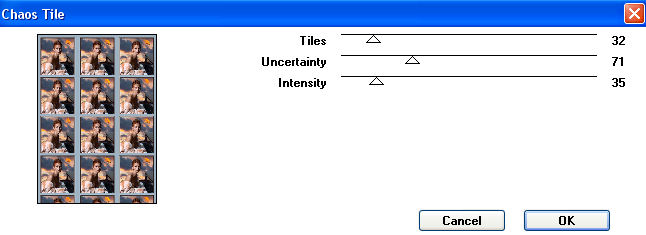 Hebe die Auswahl auf und füge Deinem Bild einen 3 Pixel breiten symmetrischen Rand in Deiner Hintergrundfarbe hinzu. 4. Such Dir eine helle ganz andere Farbe aus Deinem Bild (eine Farbe die mehr zu Eis passt) und füge Deinem Bild einen 25 Pixel breiten symmetrischen Rand in dieser Farbe hinzu. Markiere diesen Rand mit dem Zauberstab und wende den Filter Filters Factory Gallery H - Chaos Tile mit folgenden Einstellungen an: