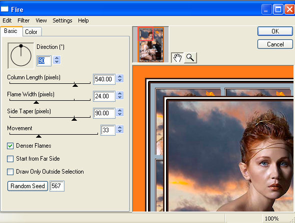 Hebe die Auswahl auf. 5. Füge Deinem Bild einen 3 Pixel breiten symmetrischen Rand in Deiner Hintergrundfarbe hinzu. Füge Deinem Bild einen 5 Pixel breiten symmetrischen Rand in Deiner ursprünglichen Vordergrundfarbe hinzu (Du hattest sie Dir ja notiert). Gehe auf Effekte - 3D-Effekte - Innenfase und übernimm die Einstellungen.... sie sind ja noch drin. Hebe die Auswahl auf und füge Deinem Bild einen 3 Pixel breiten symmetrischen Rand in Deiner Hintergrundfarbe hinzu. 6. Suche Dir jetzt aud Deinem Bild eine wieder andere Farbe (eine Farbe, die mehr zu Feuer passt) und füge Deinem Bild einen 25 Pixel breiten symmetrischen Rand in dieser Farbe hinzu. Markiere den Rand mit dem Zauberstab und wende den Filter Alien Skin - Eye Candy 4000 - Fire mit diesen Einstellungen an: