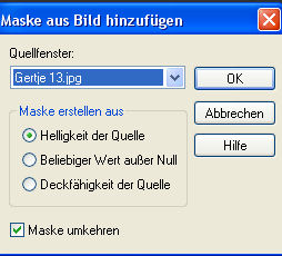 Dieses Tutorial habe ich selbst entworfen und es unterliegt meinem Copyright. Das Material stammt aus Tauschgruppen und das Copyright liegt beim jeweiligen Künstler. Ich habe das Tutorial mit Paint Shop Pro X2 geschrieben, es läßt sich aber problemlos mit allen anderen Versionen nachbasteln. Du benötigst: Paint Shop Pro Tuben: 1 Maske 1 Hintergrundbild oder -textur 1 Landschaftstube 1 Augentube 1 Tiertube 1 Frauentube Mein Material kannst Du Dir hier herunterladen. Filter: Muras Seamless - Emboss at Alpha Xero - Porcelain Hast Du alles zusammen? Dann laß uns beginnen! 1. Öffne Dir ein neues transparentes Arbeitsblatt in 700 x 550 Pixel Größe. 2. Such Dir aus Deinen Tuben eine helle Vordergrundfarbe (meine ist #c5ccd0) und eine dunkle Hintergrundfarbe (meine ist #454d5a). 3. Gehe auf Auswahl - Alles auswählen und kopiere das Hintergrundbild "JHanna-38background.jpg" oder Dein eigenes Hintergrundbild. Füge es auf Deinem Bild in eine Auswahl ein. Hebe die Auswahl auf. 4. Kopiere das Tube "Waterfall_MistedbyKathy_Kms.pspimage" oder Dein eigenes Landschaftstube und füge es auf Deinem Bild als neue Ebene ein. Setze es mittig. Im Ebenenmanager setze den Mischmodus auf "Weiches Licht". 5. Kopiere das Tube "SKF_Eyes114.08.pspimage" oder Dein eigenes Augentube und füge es als neue Ebene auf Deinem Bild ein. Verschiebe es nach oben und rechts an den Rand und im Ebenenmanager setzt Du die Deckfähigkeit auf 30% herunter. 6. Fasse alle Ebenen sichtbar zusammen (Ebenen - Einbinden - Sichtbare zusammenfassen). Dupliziere Dein Bild und bleibe auf der duplizierten Ebene. 7. Öffne die Maske "Gertje13.jpg" oder Deine eigene Maske im PSP und minimiere sie. Gehe auf Ebene - Neue Maskenebene und suche Dir Deine Maske. Lade sie mit folgenden Einstellungen: