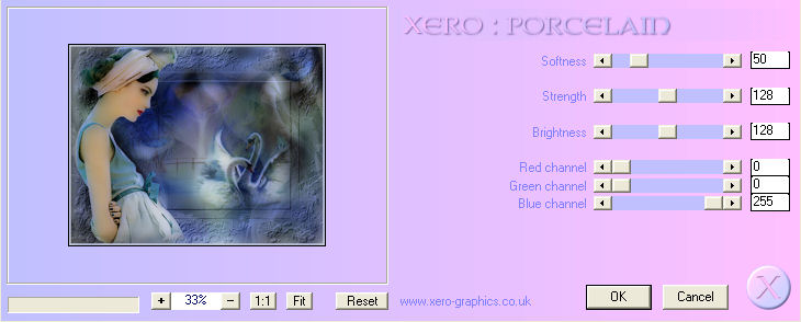 Hebe die Auswahl auf. 12. Fasse alle Ebenen sichtbar zusammen (Ebenen - Einbinden - Sichtbare zusammenfassen). Wende den Filter Xero - Porcelain mit diesen Einstellungen an: