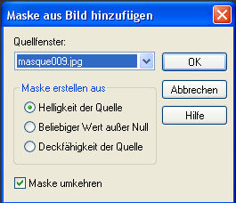 Dieses Tutorial habe ich geschrieben und es unterliegt meinem Copyright. Die Tuben stammen aus Tauschgruppen und das Copyright liegt beim jeweiligen Künstler. Ich habe das Tutorial mit Paint Shop Pro X2 geschrieben, es läßt sich aber mit jeder anderen Version problemlos nachbasteln. Ihr benötigt: Paint Shop Pro Animationsshop Tuben: 1 Blumentube 1 schöne Form (meine ist von Elisabeth - Danke Dir dafür Elisabeth) 1 Maske 1 Animationsdatei Mein Material könnt Ihr Euch hier herunterladen. Filter: Graphics Plus - Cross Shadow Die Form legt Ihr Euch in Euren Formenordner von PSP bevor Ihr PSP öffnet. Habt Ihr alles zusammen.... dann laßt uns beginnen! 1. Öffnet Euch ein transparentes Arbeitsblatt in 600 x 500 Pixel Größe und sucht Euch aus Eurem Tube eine helle Vordergrundfarbe (meine ist #ceb5b5) und eine dunklere Hintergrundfarbe (meine ist #ad7394) und füllt Euer Blatt mit der Vordergrundfarbe. 2. Kopiert Euer Blumentube oder die Tube "mc2591.pspimage" und fügt sie auf Eurem Blatt als neue Ebene ein. Wenn Ihr ein eigenes Tube verwendet müßt Ihr es entsprechend größenmäßig anpassen. Wenn Ihr meines nehmt passt es haargenau von der Größe her. 3. Ebenen - Neue Rasterebene und füllt diese mit Eurer Hintergrundfarbe. 4. Öffnet die Maske "masque009.jpg" im PSP und geht auf Ebenen - Neue Maskenebene und sucht Euch dort die Maske und wendet sie mit folgenden Einstellungen an: