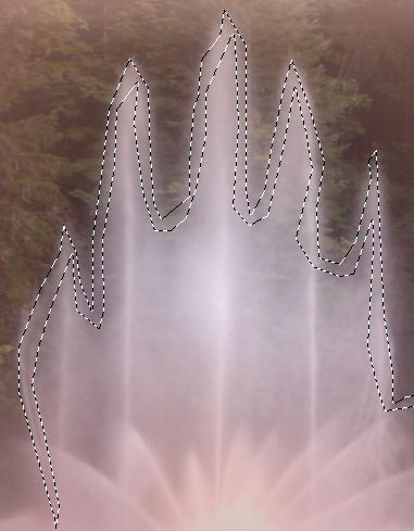 Dieses Tutorial habe ich selbst entworfen und es unterliegt meinem Copyright. Das Material stammt aus Tauschgruppen und das Copyright liegt beim jeweiligen Künstler. Ich habe das Tutorial mit Paint Shop Pro X2 geschrieben, es läßt sich aber mit allen anderen Versionen problemlos nachbasteln. Du benötigst: Paint Shop Pro Animationsshop Tuben: 1 Fontaine-Tube oder Wasserfall oder ähnliches 1 Paartube Mein Material kannst Du Dir hier herunterladen. Filter: Werden diesmal nicht benötigt. Hast Du alles beisammen? Na dann lass uns beginnen! 1. Öffne Dir ein neues transparentes Arbeitsblatt in 700 x 650 Pixeln Größe. 2. Suche Dir aus Deinen Tuben eine helle Vordergrundfarbe (meine ist #ad7c70) und eine dunkle Hintergrundfarbe (meine ist #2f2a28). Fülle Dein Blatt mit der Vordergrundfarbe. 3. Lege eine neue Rasterebene an und gehe auf Auswahl - Alles auswählen. 4. Kopiere das Tube " mds1012font.05.11.06pspimage.pspimage" oder Deine eigene Fontaine oder Wassertube und füge sie auf Deinem Bild in eine Auswahl ein. Hebe die Auswahl auf. 5. Umkreise mit Deinem Freihandauswahlwerkzeug den äußeren Rand Deiner Fontaine. So sieht das bei mir aus: