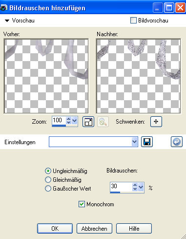 Dupliziere diese Auswahl 2 mal und benenne die Ebenen wie folgt um: unterste Auswahlebene = Fonatine1 mittlere Auswahlebene = Fontaine2 oberste Auswahlebene = Fontaine3 5. Aktiviere die Ebene Fontaine1 und gehe auf Anpassen - Bildrauschen hinzufügen/entfernen - Bildrauschen hinzufügen und nehme dort diese Einstellungen vor:
