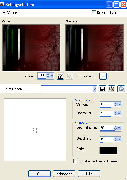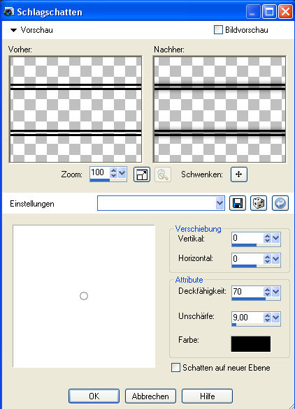 5. Fülle diese Auswahl mit Deiner Hintergrundfarbe. Auswahl - Ändern - Verkleinern - um 3 Pixel und drücke einmal die Entf-Taste. Auswahl - Ändern - Verkleinern - um 3 Pixel und fülle nochmal mit Deiner Hintergrundfarbe. Auswahl - Ändern - Verkleinern - um 3 Pixel und drücke die Entf-Taste. Hebe die Auswahl auf und wende diesen Schlagschatten an: