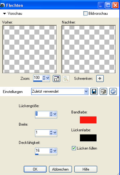 6. Dupliziere diese Ebene und verschiebe sie ein kleines Stück nach rechts und nach oben. Fasse die Ebene nach unten zusammen. Dupliziert noch einmal und spiegelt die duplizierte Ebene einmal Vertikal und einmal Horizontal. 7. Kopiert jetzt das Tube "wine-rg.pspimage" oder Euer eigenes Tube und fügt es als neue Ebene auf Eurem Blatt ein. Wenn Ihr das beigelegte Tube verwendet, dann ändert die Größe auf 70% (Größe aller Ebenen anpassen nicht angehakt) und schiebt das Tube nach links an den Rand. 8. Kopiert das Tube "Thaiss...B-V-08.pspimage" oder Eure eigene Gesichtstube und fügt es auf Eurem Bild als neue Ebene ein. Setzt die Deckfähigkeit im Ebenenmanager auf 60% herunter. und schicbt sie Euch passend auf Euer Bild. 9. Fasst alle Ebenen sichtbar zusammen und fügt einen Rand von 3 Pixeln in schwarz oder Eurer dunklen Hintergrundfarbe hinzu. 10. Fügt einen Rand von 15 Pixeln in Eurer Vordergrundfarbe hinzu, markiert den Rand mit dem Zauberstab und geht auf Effekte - Textureffekte - Flechten mit diesen Einstellungen: