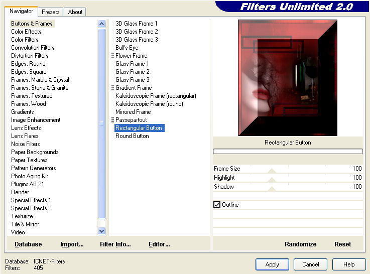 und wendet den Schlagschatten auch nochmal mit Minuswerten bei Vertikal und Horizontal an. 13. Geht auf Eure unterste Ebene und spiegelt sie einmal vertikal und wende den Filter Filters Unlimited - Button & Frames - Rectangular Button mit folgenden Einstellungen an: