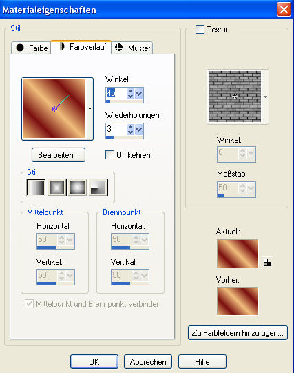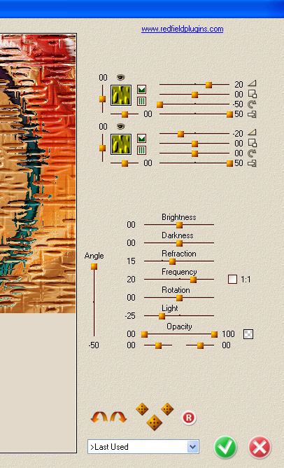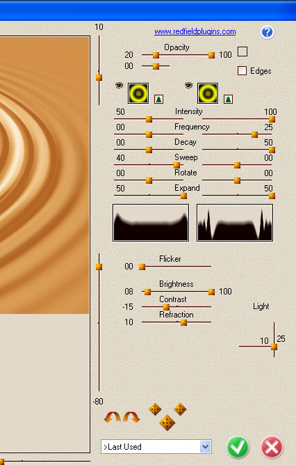 Dieses Tutorial habe ich selbst entworfen und es unterliegt meinem Copyright. Das Material stammt aus Tauschgruppen und das Copyright liegt beim jeweiligen Künstler. Ich habe das Tutorial mit Paint Shop Pro X2 geschrieben, es läßt sich aber auch mit allen anderen PSP-Versionen problemlos nachbasteln. Du benötigst: Paint Shop Pro Tuben: 1 Getränketube Ich lege diesmal kein Material dabei, denn EINE Tube die passt, hat jeder. Filter: Redfield Plugins - Water Ripples Redfield Plugins - Craquelure 3D Kang 3 - My Baby eats Light Grapics Plus - Cross Shadow Filter Factory Gallery B - Circulator II Hast Du alles zusammen? Dann lass uns beginnen! 1. Öffne Dir ein neues transparentes Arbeitsblatt in 600 x 400 Pixel Größe. 2. Suche Dir aus Deinen Tuben eine helle Vordergrundfarbe (meine ist #efbd7b) und eine dunklere Hintergrundfarbe (meine ist #7b1010). Fülle Dein Blatt mit der Vordergrundfarbe. 3. Kopiere Deine Getränketube und füge es als neue Ebene auf Deinem Bild ein. Verschiebe sie etwas nach links zum Rand hin, aber nicht direkt an den Rand setzen. Die Deckfähigkeit setzt Du im Ebenenmanager auf 50% herunter. Ebenen - Einbinden - Sichtbare zusammenfassen. 4. Wende nun den Filter Redfield Plugins- Water Ripples mit diesen Einstellungen an:
