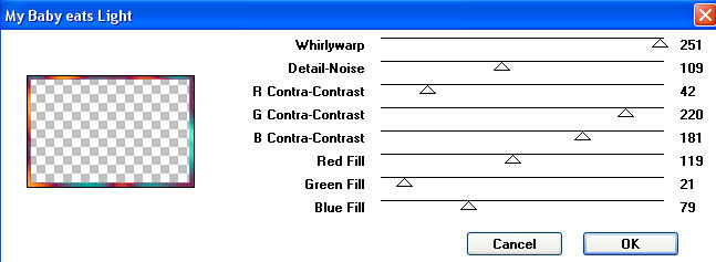 13. Lege eine neue Rasterebene an und gehe auf Auswahl - Alles auswählen. Fülle die Auswahl mit Deinem Farbverlauf. Auswahl - Ändern - Verkleinern - um 10 Pixel und drücke einmal die Entf-Taste auf Deiner Tastatur. Auswahl - Umkehren Wende den Filter Kang 3 - My Baby eats Light mit folgenden Einstellungen an: