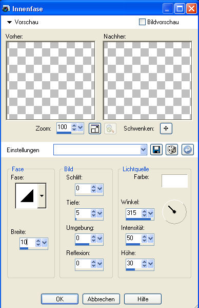 9. Effekte - 3D-Effekte - Innenfase mit folgenden Einstellungen: