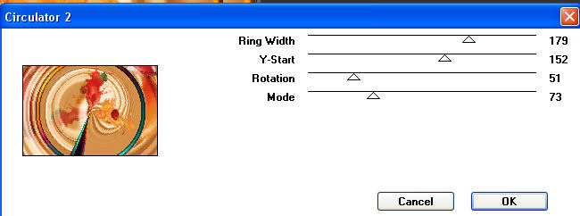 Hebe die Auswahl auf. 10. Fasse alle Ebenen sichtbar zusammen. Dupliziere die Ebene einmal. Bleibe auf der Kopie und gehe auf Bild - Größe ändern - 90%. 11. Aktiviere Deine untere Ebene und wende den Filter Factory Gallery B - Circulator II mit folgenden Einstellungen an: