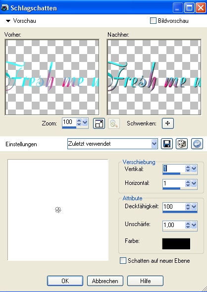 Effekte - 3D-Effekte - übernimm die Einstellungen... sie sind von vorhin noch gespeichert. Hebe die Auswahl auf. 15. Aktiviere Deine oberste Ebene. Schreibe mit Deinem Farbverlauf einen Schriftzug auf Dein Bild und vergiß an dieser Stelle Dein Wasserzeichen oder Deinen Namenszug nicht. Ich habe auf meinem Schriftzug die Filter Kang 3 - My Baby eats Light und Grapics Plus - Cross Shadow noch angewandt. Und auch dieser Schlagschatten macht sich ganz gut: