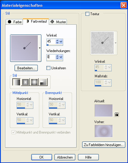 Dieses Tutorial wurde von mir entworfen und unterliegt meinem Copyright. Das Material dafür habe ich durch Tauschgruppen erhalten und das Copyright dafür unterliegt dem jeweiligen Künstler. Es wurde mit Paint Shop Pro X2 geschrieben, ein Nacharbeiten ist aber auch mit allen anderen Versionen möglich. Du benötigst für dieses Tutorial folgendes: Paint Shop Pro Animationsshop Tuben: 2 Blumentuben oder mehr, je nach Geschmack 1 Frauentube 1 animierte Tube wie Vogel oder Schmetterling evtl. Decotuben Mein Material kannst Du Dir hier herunterladen. Filter: Alien Skin Xenofex 2 - Little Fluffy Clouds Graphics Pluss - Cross Shadow Funhouse - Tunnel Tile und Xaggerate Hast Du alles beisammen? Dann laß uns beginnen. 1. Öfnne Dir ein transparentes Hintergrundbild in der Größe 700 x 600 Pixel und suche Dir aus Deinen Tuben eine hellere Vordergrundfarbe (meine ist #c6c6de) und eine etwas dunklere Hintergrundfarbe (meine ist #ada5b5). 2. Erstelle aus diesen Farben folgenden Farbverlauf: