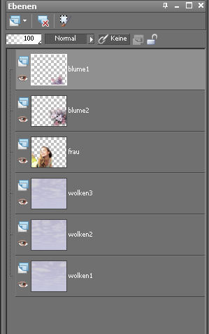 Zenith Color eure HG-Farbe und Horizon Color eure VG-Farbe 5. Auf der Ebene wolken 2 den Filter ebenfalls mit diesen Einstellungen anwenden, allerdings bei Basics einmal auf Random Seed klicken. 6. Nun noch einmal den Filter anwenden auf der Ebene wolken 3 und auch hier bei Basics einmal auf Random Seed klicken. 7. Öffnet nun das Tube "im93.pspimage" oder Euer eigenes Tube und fügt es als neue Ebene auf eurem Bild ein. Verschiebt es nach rechts unten an den Rand. 8. Öffnet das Tube "rjb-witheorchids1.psp" oder Euer zweites Blumentube und fügt es als neue Ebene auf Eurem Bild ein. Verschiebt die Ebene in der Ebenenpalette um eine Stelle nach unten und ordnet sie so an, dass Ihr einen schönen Blütenstrauß habt. 9. Öffnet das Tube "466_woman_live" oder Eure eigene Frauentube und fügt sie als neue Ebene auf Eurem Bild ein. Ordnet sie an so dass es passt und schiebt diese Ebene in der Ebenenpalette unter die beiden Blumenebenen. Meine Ebenenpalette sieht nun so aus: