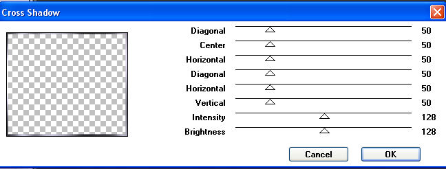 10. Fügt auf oberster Ebene nun einen schönen Schriftzug ein und vergesst auch Euer Wasserzeichen nicht. 11. Auf oberster Ebenen Auswahl - Alles auswählen - Auswahl ändern - Verkleinern - um 5 Pixel - Auswahl umkehren. 12. Neue Rasterebene und füllt die Auswahl mit Eurem Farbverlauf aus Punkt 2. 13. Wendet auf die Auswahl den Filter Graphics Plus - Cross Shadow mit den Standarteinstellungen an wie im folgenden Screen: