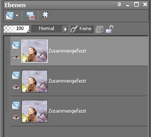 14. Dupliziert nun alle Ebenen zweimal, außer die Wolkenebenen. Macht wolken 2 und wolken 3 und alle Kopien unsichtbar und fasst sichtbar zusammen. 15. Diese zusammengefasste Ebene nun unsichtbar machen und nun die Ebene wolken 2 und die erste Kopie der anderen Ebenen sichtbar machen. Die zusammengefasste Ebene, die Ebene wolken 3 und die zweite Kopie der anderen Ebenen bleibt unsichtbar. Wieder sichtbar zusammenfassen. 16. Auch diese zusammengefasste Ebene machen wir nun unsichtbar und machen die Ebene wolken 3 und die zweite Kopie der anderen Ebenen sichtbar und fassen nocheinmal sichtbar zusammen. Am Ende muß es in Eurer Ebenenpalette so aussehen: